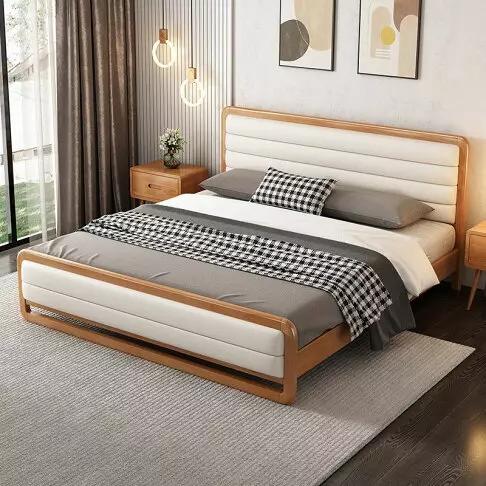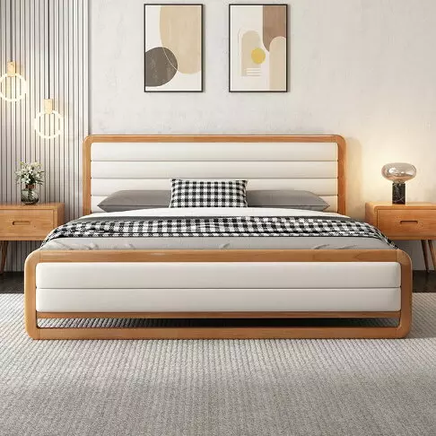 سرير مزدوج بتصميم مودرن معاصر . يتكون السرير من هيكل مصنع من خشب هندسي وخشب زان روماني عالي الجودة، مع تغطية من الجلد الإيطالي المميز والناعم المبطن بإسفنج عالي الكثافة. تضمن هذه المواد راحة فائقة ودعمًا مثاليًا للظهر أثناء النوم.